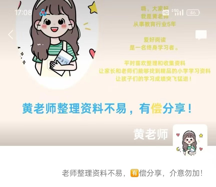 咱们做k12教育卖资料的一定要把账号包装成:老师,让家长看起来你是一名老师,很多圈友会说馆主,我不喜欢骗人啊,停!这不是骗人,我们只是给网络上的我定义一种身份而已,我们没有行骗,家长发钱我们发资料。
