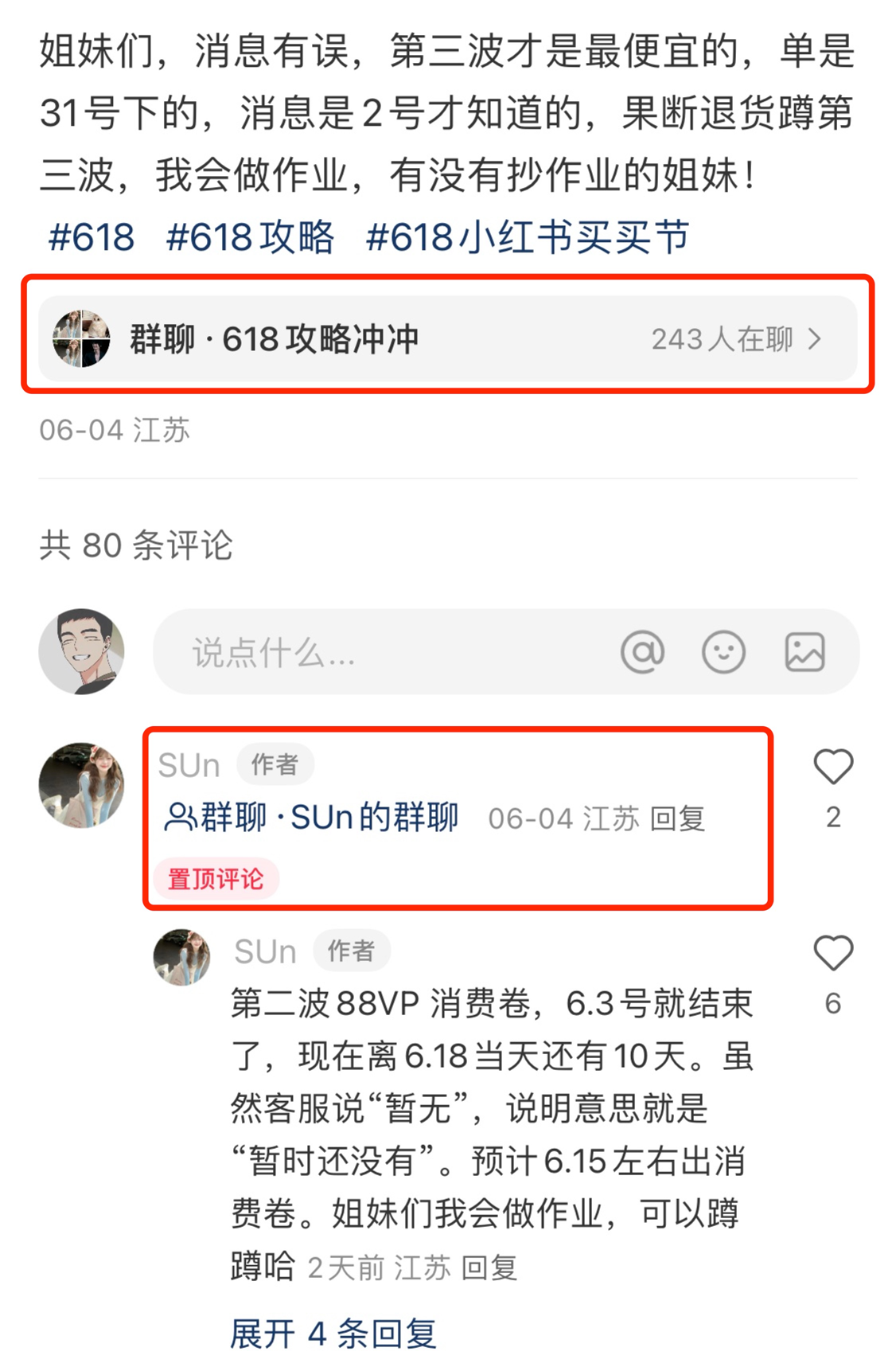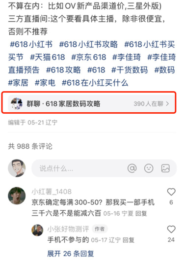 流量好的笔记在评论区也把群聊置顶,写上618+具体类目+分享、跟买群,这个操作在小红书官方是没有任何问题的,所以也不怕举报。