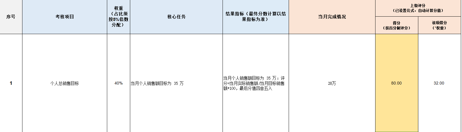 当月完成的实际情况与既定的目标的比值得出该项的得分,如下图,其中一项销售目标的得分,目标 35 万,实际 28 万,最终得分:28/35*100%*40%=32 分