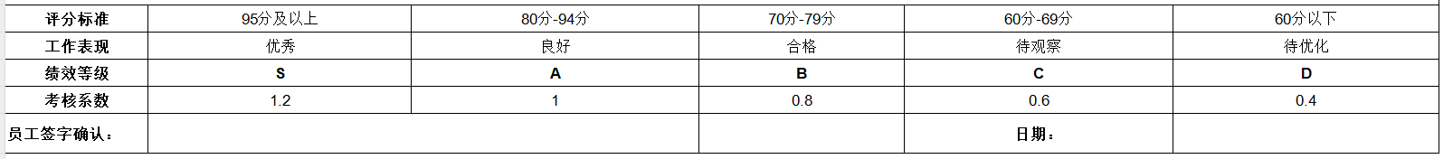 同样,其他的几项也是相同的方法得出分值,最后求和得出总分。在总分的这个考核中,还有一个考核系数,这个考核系数会直接影响到绩效工资的多少。